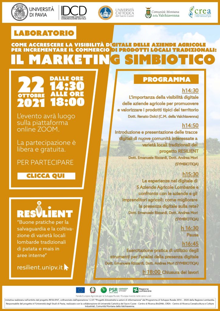 Come accrescere la visibilità digitale delle imprese agricole: se ne parla in un seminario on line dell'ambito del progetto RESILIENT, promosso dall'Università di Pavia. Appuntamento il 22 ottobre 2021.