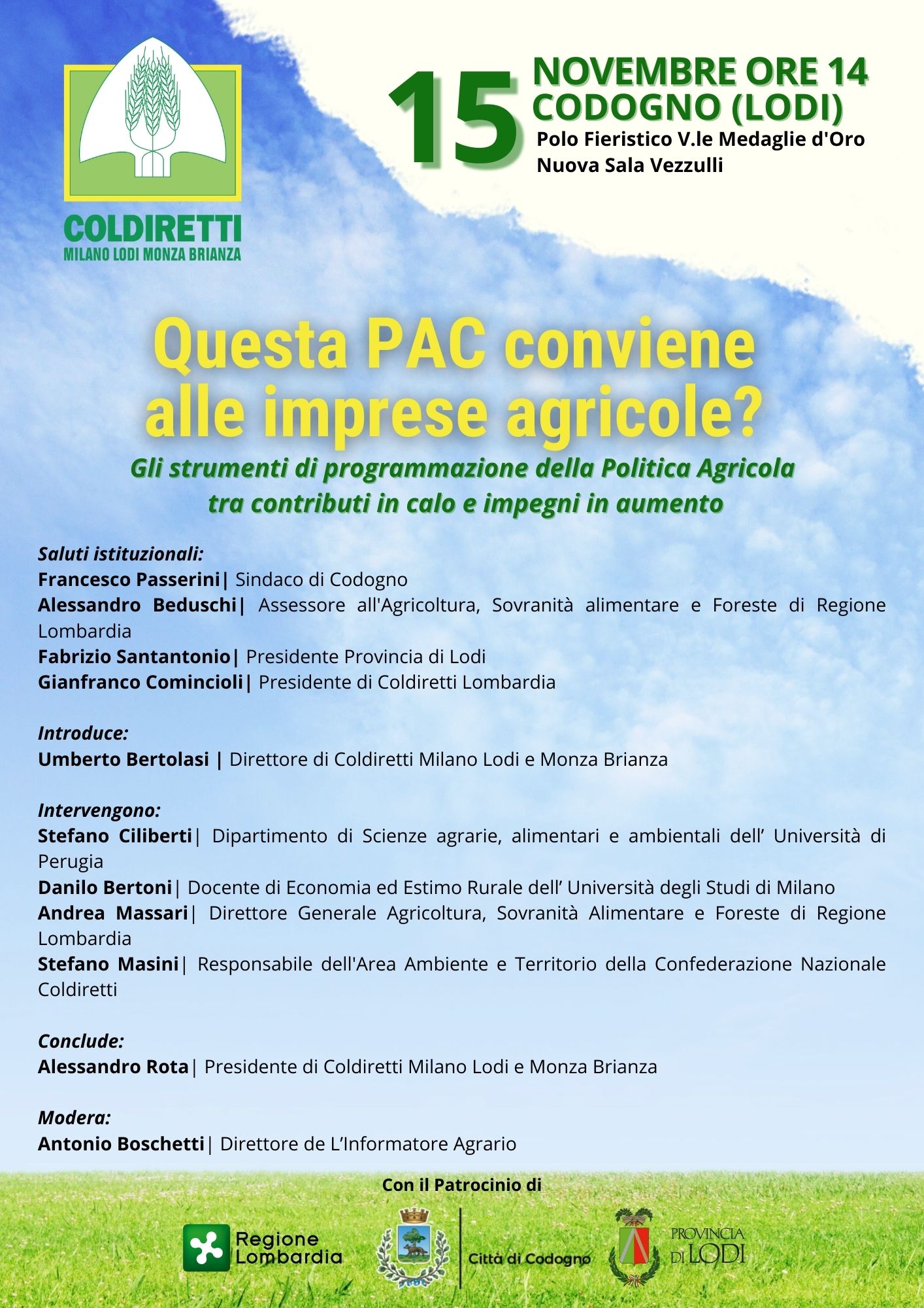 Le relazioni saranno affidate a: Stefano Ciliberti del Dipartimento di Scienze agrarie, alimentari e ambientali dell’Università di Perugia; Danilo Bertoni, docente di Economia ed Estimo rurale dell’Università degli Studi di Milano; Andrea Massari, direttore generale della DG Agricoltura, Sovranità alimentare e Foreste di Regione Lombardia; Stefano Masini, responsabile dell’Area Ambiente e Territorio della Confederazione nazionale Coldiretti. Introduce Umberto Bertolasi, direttore della Coldiretti di Milano, Lodi e Monza Brianza.